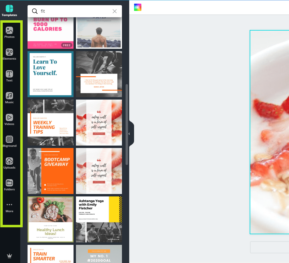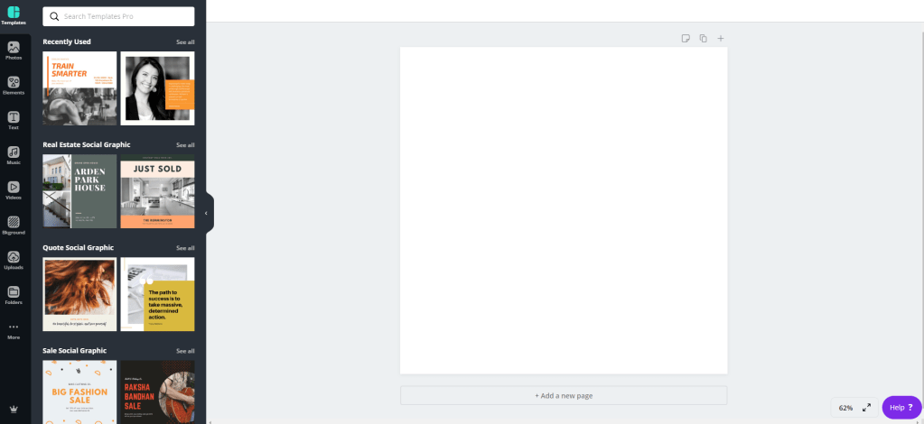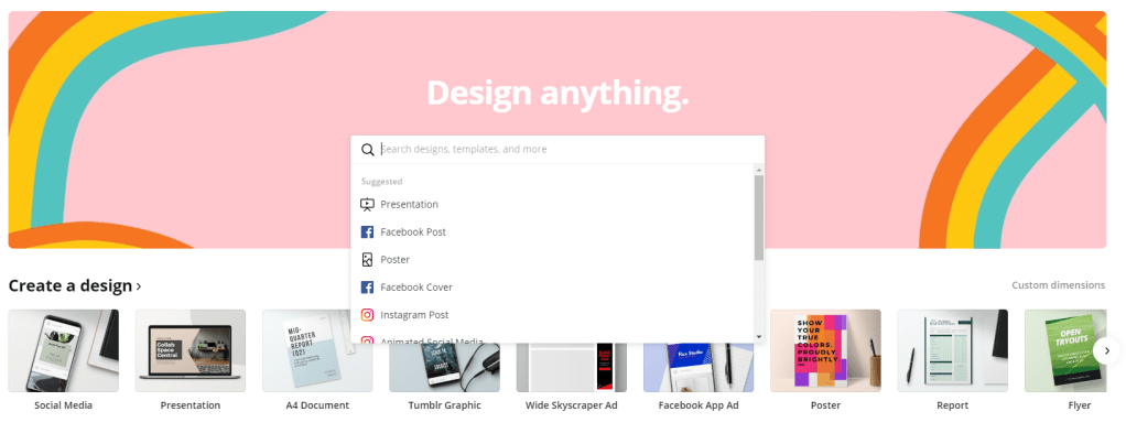 As soon as you select the project or the dimensions, Canva (based on the size or theme of your project) will recommend you a lot of available designs where once you change the colors, adjust the text and add your own images, you will obtain what you wanted.